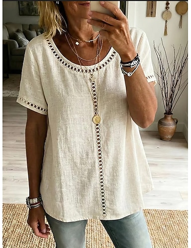 女性用 Tシャツ フェイクリネンシャツ ティートップ ホール 平織り ファッション スタイリッシュ クラシック 半袖 クルーネック レギュラートップス 日常 お出かけ 週末 ブルー ブラック ホワイト イエロー ピンク 夏 春