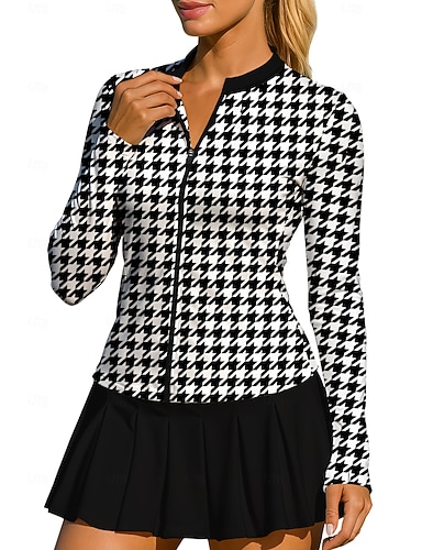 女性用 男女兼用 幾何学模様 千鳥格子 トップス スポーツシャツ テニスシャツ テニストップ 長袖 ジッパー 花柄 UPF50+ UV耐性 高弾性 吸汗性 高通気性 バレーボール テニス ゴルフ ラウンド ハイネック ジャケット Tシャツ 白と黒 テニスウェア