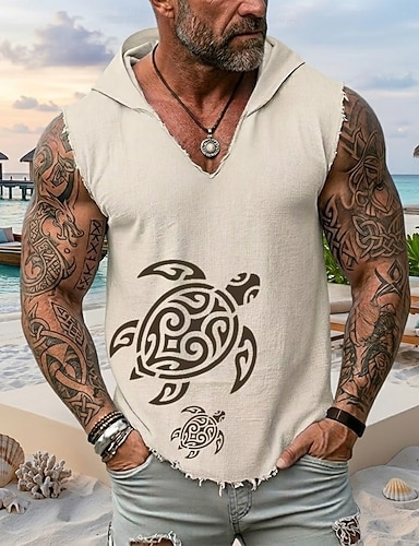 メンズ トライバル ウミガメ ポリネシアン ボヘミアン 沿岸 ノースリーブ フーディー タンクトップ グラフィック コットン リネン フリンジ 切りっぱなしの裾 ゆったりフィット ビーチ バケーション デザイナー アパレル S M L XL XXL XXXL