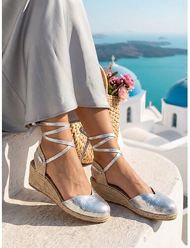 レディース レースアップ ウェッジサンダル - エレガントなエスパドリーユ クローズドトゥ ヒール、足首ラップ付き。アイランドバケーション、地中海旅行、夏のリゾートウェアに最適