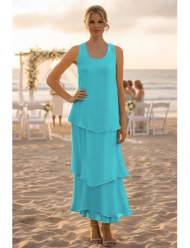 タイト/コラム アンクル丈 ウェディングゲストドレス フォーマルドレス ティアードワンピース マダムドS ノースリーブ Vネック エレガント シンプル 結婚式のゲスト セミフォーマル シフォン 〜と 多層 ソリッドカラー