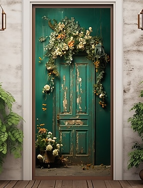 花ヴィンテージグリーンドアカバー壁画装飾ドアタペストリードアカーテン装飾背景ドアバナー取り外し可能なフロントドア屋内屋外ホームルーム装飾農家の装飾用品