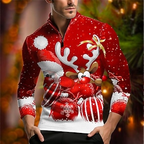 クリスマス メンズ クリスマス アニマル 3D ジッパー ポロ サンタクロース ヘラジカ カジュアル プリント 3D ワッフル ジップ アウトドア カジュアル デイリー ストリートウェア ワッフル生地 長袖 ジップ シャツ ブラック ワイン 秋&冬 s m l