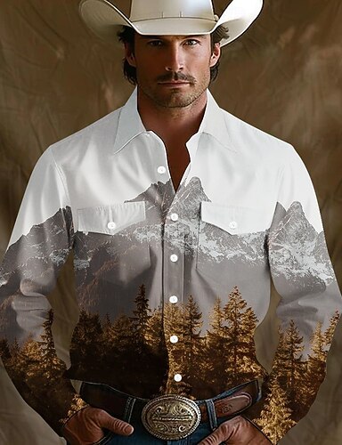 男性用 自然、風景 マウンテン ウエスタンシャツ ボタンアップシャツ カウボーイシャツ 長袖 西洋料理 ヴィンテージレトロ アウトドア キャンピング&ハイキング 春 秋 折襟 襟付きシャツ フロントポケット2つ ホワイト