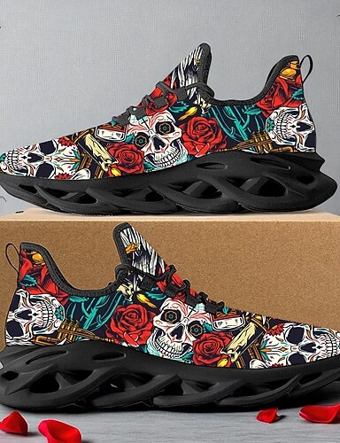 メンズローズスカルプリントレースアップスニーカー - パーティー、コスプレ、普段着にぴったりの快適なソールを備えたゴシックカジュアルハロウィンシューズ