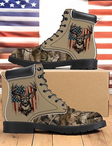 愛国的な鹿のプリントが施されたメンズハンティングブーツ - 耐久性のあるカモフラージュレースアップアウトドアシューズ