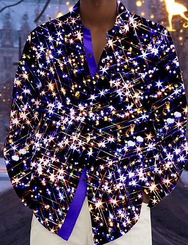クリスマス メンズ クリスマス ライト プリント シャツ キラキラ ハワイアン カジュアル ボタン アップ ビーチ 長袖 パーティー イブニング 大晦日 シャツ 秋 冬 春&夏用襟付きシャツ 3Dプリント