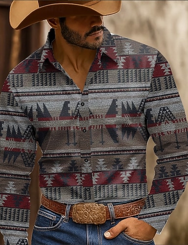 男性用 幾何学模様 エスニック インドの文化 シャツ ウエスタンシャツ カウボーイシャツ 長袖 ヴィンテージレトロ アウトドア カジュアル 作業服 春 秋 折襟 3Dプリント ボタンアップシャツ ブルー ワイン グリーン