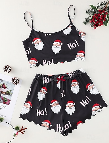 クリスマス レディース パジャマ ラウンジウェア パジャマセット パジャマ ショーツ ファッション シンプル カジュアル グラフィック 漫画 サンタクロース ショーツ ホーム ベッド ノースリーブ レッド ブラック ブラック ホワイト ピンク レッド 夏 春 秋 冬