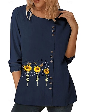 女性用 ブラウス フラワー グラフィック 植物 エレガント ヴィンテージ ファッション 長袖 クルーネック レギュラートップス 日常 お出かけ 週末 ホワイト ブルー ダークブルー 秋