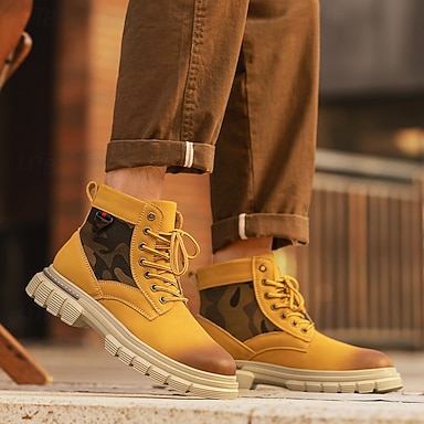 メンズイエローアウトドアワークブーツ - 耐久性のあるレザーとラバー構造、ハイキング、仕事、アウトドア活動に最適な快適でスタイリッシュなブーツ