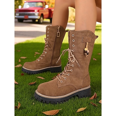 チャンキーソールを備えたレディースミッドカーフレースアップコンバットブーツ、アウトドアやストリートウェアに最適なカジュアルなミリタリースタイルのブーツ