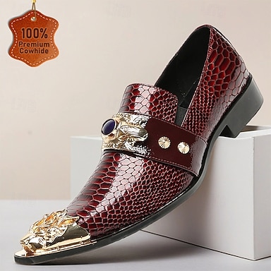 メンズ本革ブルゴーニュスネーク柄スリッポンローファー、メタルバックル付き - エレガントなパーティーやイブニングドレスシューズ
