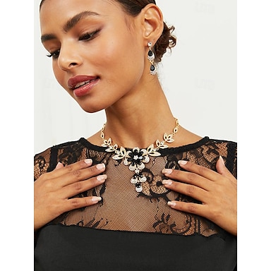 黒い宝石とクリスタルを使用したエレガントなジュエリーセット - イブニングウェアや特別な機会に最適なゴールドトーンのネックレスとイヤリング