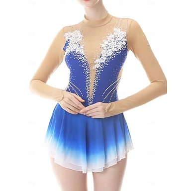 フィギュアスケート ドレス 女性用 女の子 アイススケート ドレス ブルー パッチワーク アシンメトリーヘム メッシュ 高弾性 訓練 競技大会 スケートウェア クラシック クリスタル・ラインストーン 長袖 アイススケート フィギュアスケート