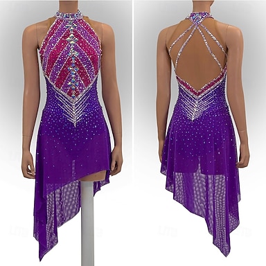 フィギュアスケート ドレス 女性用 女の子 アイススケート ドレス パープル パッチワーク アシンメトリーヘム メッシュ スパンデックス 高弾性 訓練 競技大会 スケートウェア クラシック クリスタル・ラインストーン ノースリーブ アイススケート フィギュアスケート