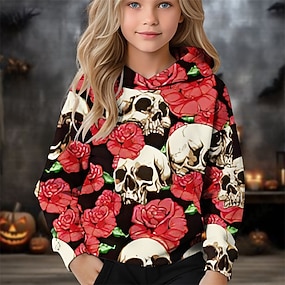 ハロウィーン 女の子 3D フラワー スカル パーカー 長袖 秋 冬 ファッション 愛らしい ベーシック 子供 4〜12年 フード付き アウトドア カジュアル 日常 レギュラー