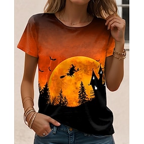 ハロウィン 女性用 T シャツ ウィッチ ティー プリント デイリー カジュアル ショートスリーブ クルーネック ラウンドネック オレンジ 夏