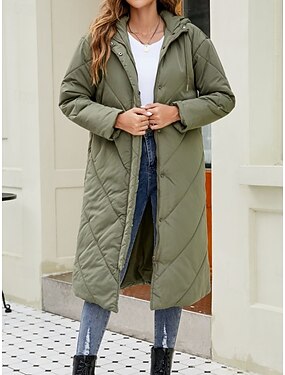 女性用 冬物コート ダウン 保温 快適 ジッパー ポケット ファッション カジュアル 平織り バケーション ストリート カジュアル デイリーウェア ロング フード付き レギュラー 長袖 アウターウェア ブラック ライトグリーン アーミーグリーン 秋 冬