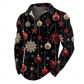 クリスマス 男性用 各 スノーフレーク柄 ジップポロシャツ 長袖 ポロシャツ ラペル カジュアル アウトドア フェスティバル衣装 3Dプリント 秋 冬 ブラック ルビーレッド グリーン