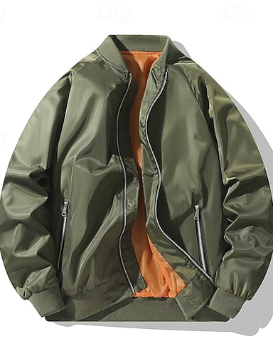 男性用 軽量ジャケット ボンバージャケット カジュアルジャケット バケーション 日常 ポケット 春 秋 平織り ファッション クラシック スタンド レギュラー ブラック アーミーグリーン ジャケット