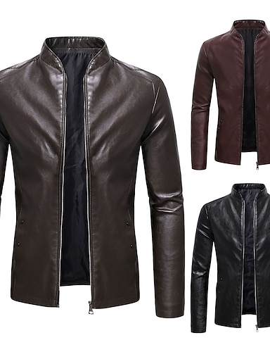 男性用 レザージャケット トランジションジャケット バイカージャケット 赤い革のジャケット フォーマル ストリート 保温 防風 調整可能 秋 ピュアカラー フォーマル スタンド レギュラー レギュラー 合皮 スリム ブラック ワイン コーヒー ジャケット