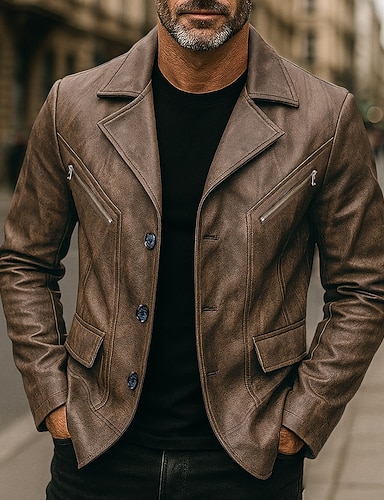 男性用 レザージャケット フォーマル 家 フルジップ 冬 春 & 秋 純色 ヴィンテージ ファッション シャツカラー レギュラー ブラック ホワイト バーガンディー ブラウン ジャケット
