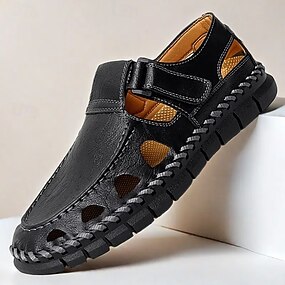 メンズのブラックフェイクレザーフィッシャーマンサンダル。ベルクロストラップと通気性のあるデザイン。アウトドア、カジュアル、夏のアクティビティに最適なスタイリッシュで快適なサンダル。