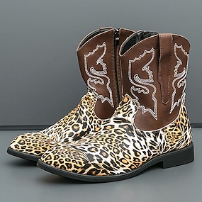 メンズヒョウ柄カウボーイブーツ - ロデオ、ステージパフォーマンス、ファッションパーティーに最適な、エキゾチックなフェイクレザーのウエスタンスタイルのミドルカーフブーツ
