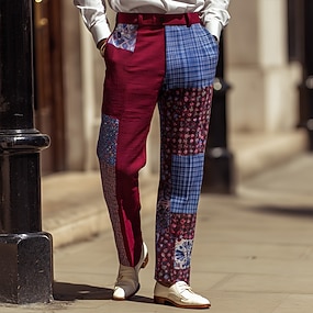 男性用 幾何学模様 カラーブロック パッチワーク スーツ ズボン スーツパンツ ミディアムウエスト ヴィンテージ アウトドア バケーション レギュラーフィット フラットフロント ポケット付きストレートレッグパンツ 夏 春 秋 3Dプリント ワイン カーキ色