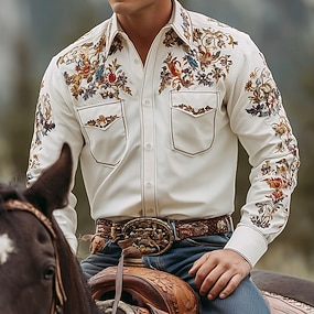 男性用 フラワープリント コサージュ シャツ ウエスタンシャツ カウボーイシャツ 長袖 ヴィンテージレトロ アウトドア カジュアル 作業服 春 秋 折襟 フロントポケット2つ リネンライクシャツ ボタンアップシャツ ピンク ブルー パープル アプリコット