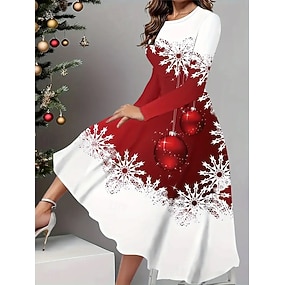 女性用 ミディドレス A ラインドレス フィット&フレアドレス 旅行度假风 カジュアル ボヘミアン パーティー 日常 お出かけ レギュラー グラフィック スノーフレーク柄 長袖 クルーネック ルビーレッド 夏 春 秋 冬