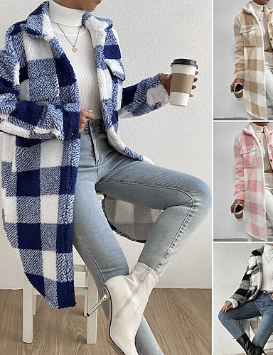 女性用 シェルパジャケット 快適 高通気性 ポケット ボタン プリント カジュアル チェック バケーション ストリート カジュアル デイリーウェア シングルブレスト ロング 折襟 ルーズフィット 長袖 アウターウェア ブラック ピンク ブルー 春 秋
