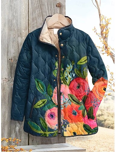 女性用 冬物ジャケット パフジャケット 保温 快適 ポケット ボタン プリント ファッション 日常 屋外 フラワー バケーション カジュアル 日常 シングルブレスト レギュラー スタンド レギュラー 長袖 アウターウェア ブルー ダークグリーン オレンジ 秋 冬