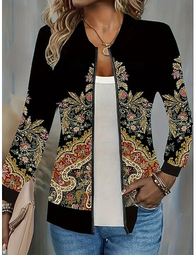 女性用 ジャケット 日常着 プリント フラワー カジュアル/普段着 エレガント レギュラー アウターウェア 長袖 春 ブラック S