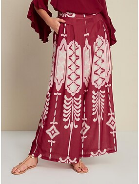 レディース シフォン エスニック フローラル プレースメント プリント 伸縮性ウエスト プリーツ ルーズ ストレート ワイドレッグ パンツ