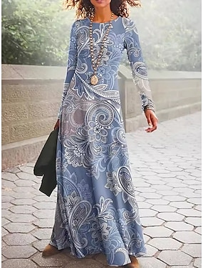 ウィメンズマキシドレス ヴィンテージボヘミアン Aラインドレス クルーネック ロングスリーブ カジュアル デイリー レギュラーフィット グラフィック ペイズリー ブルー ダークグリーン グリーン 春 秋 冬