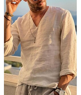 男性用 シャツ リネンシャツ コットンリネンシャツ サマーシャツ ビーチシャツ 平織り カジュアル 日常 カーキ色 長袖 Vネック 春夏 衣類