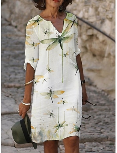 女性用 ミニドレス カジュアルドレス プリントドレス ファッション 近代の 日常 ビーチ 週末 レギュラー ライン 七分袖 スプリットネック ホワイト 夏 春 秋