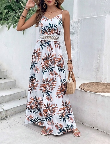 女性用 マキシドレス A ラインドレス 花柄ドレス サマードレス キャミドレス エレガント スタイリッシュ バケーション 日常 デート レギュラー フラワー ノースリーブ Vネック ホワイト 夏
