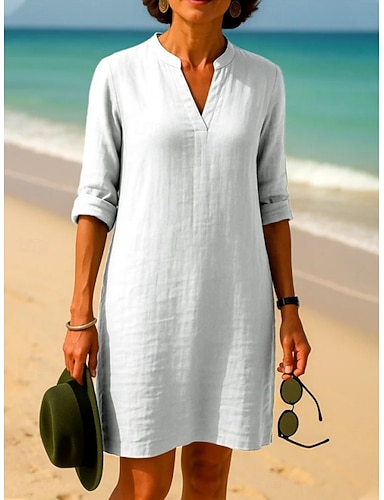 女性用 ミニドレス カジュアルドレス シフトドレス サマードレス ファッション 近代の 日常 ビーチ 週末 レギュラー 平織り 七分袖 Vネック ブラック ホワイト ブルー グリーン 夏 春 秋