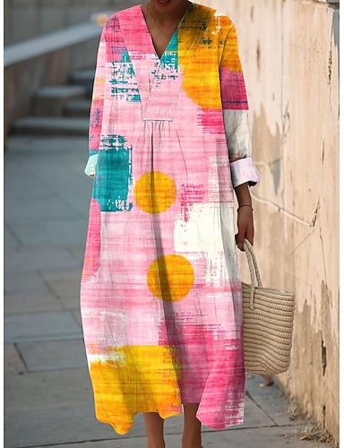 ウィメンズミディドレス Vネック長袖カフタン軽量ルーズフィットAラインドレスカジュアルボヘミアン外出スタンダードフィットグラフィック幾何学的長袖Vネックピンクオレンジアメジスト秋