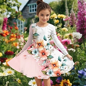 イースター 女子 3D フラワー グラフィック ドレス 長袖 3Dプリント 夏 春 秋 バケーション スポーツ 日常 かわいいスタイル カジュアル 美しい 子供 3〜12年 カジュアルドレス A ラインドレス 膝上 レギュラー
