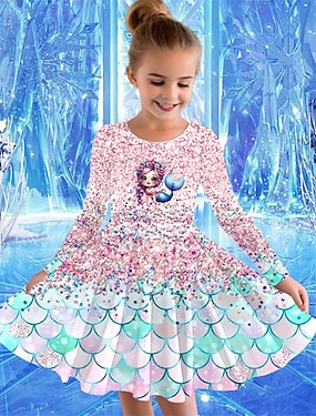 女子 3D グラフィック マーメイド ドレス 長袖 夏 春 バケーション 日常 祝日 プリンセス 美しい 甘い 子供 4〜12年 カジュアルドレス A ラインドレス 膝丈 レギュラー