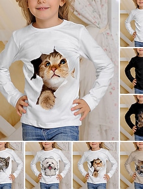 女の子 3D 動物 猫 Tシャツ 長袖 3Dプリント 秋 冬 活発的 ファッション 日常 子供 3〜12年 アウトドア 日常 レギュラー