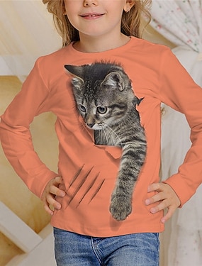 女の子 3D 動物 猫 Tシャツ 長袖 3Dプリント 秋 冬 活発的 ファッション 日常 子供 3〜12年 アウトドア 日常 レギュラー