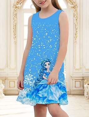 女子 3D グラフィック カートゥン スノーフレーク柄 ドレス ノースリーブ 夏 春 バケーション 日常 祝日 プリンセス 美しい 甘い 子供 4〜12年 カジュアルドレス A ラインドレス 膝丈 レギュラー