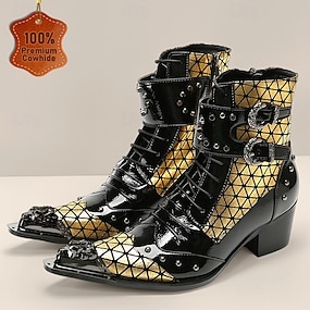 メンズのブラックとゴールドの幾何学模様のウエスタンブーツ。スタッズディテールが施されています。パーティー、ナイトライフ、ファッションイベントに最適な大胆なファッションフットウェアです。