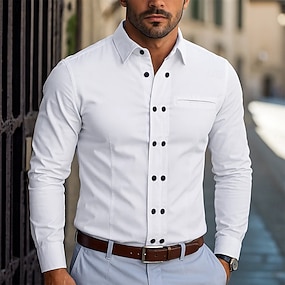 男性用 ドレスシャツ 平織り 結婚式 アウトドア ホワイト 長袖 折襟 オールシーズン 衣類 ポケット