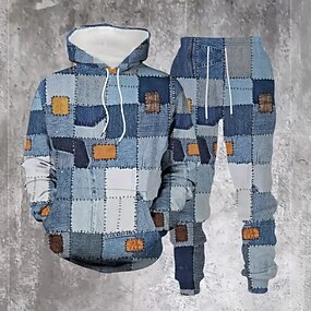 男性用 カラーブロック 2個 3Dスウェットシャツセット トラックスーツ フーディースウェットシャツ 長袖 長ズボン フード付き カジュアル 普段着 アスレイジャー デイリーウェア 3Dプリント 春 秋 冬 ブルー